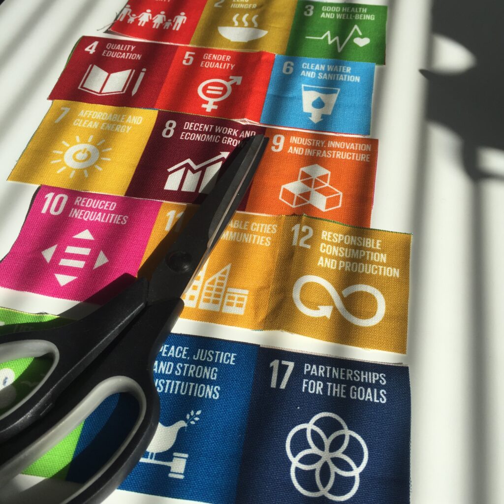 Verschillende doelen bij modeproductie zoals *1 geen armoede *3 gezondheid, *4 educatie, *5 gender gelijkheid, *6 schoon water, *8 eerlijke handel, *10 ongelijkheid , *12 duurzame productie en comsumptie, *13 klimaat, *15 leven op het land