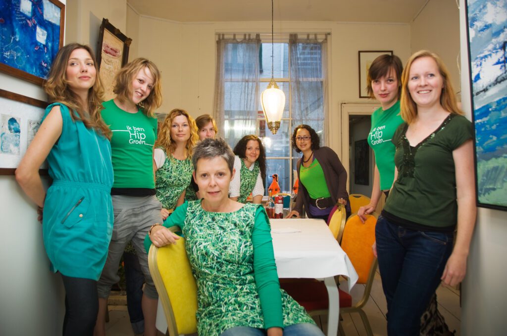 Het idee om duurzaamheid op een frisse manier onder de aandacht te brengen had vorm gekregen in een FRISGROEN duurzaam mode-en leefstijl feest. Om het van mens tot mens ( van hart tot hart) aan elkaar te vertellen, is er een vrijwilligers promotie teams ontstaan -> de Groenkapjes. In het vrijwilligersteam zaten studenten, Zwollenaren en ambtenaren van de gemeente Zwolle die model waren geweest bij eerdere duurzame modeshows. Met regelmaat kwamen we bij elkaar in Cafe de Hete Brij om te denktanken “Hoe kunnen andere Zwollenaren te enthousiasmeren voor duurzaamheid”. Er groeide een Groenkapje team voor guerrilla promotie activiteiten en voor het showen van duurzame mode on the catwalk. Zoals de modeshow bij Stoere Vrouwen event in studio K te Amsterdam.