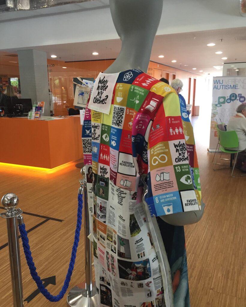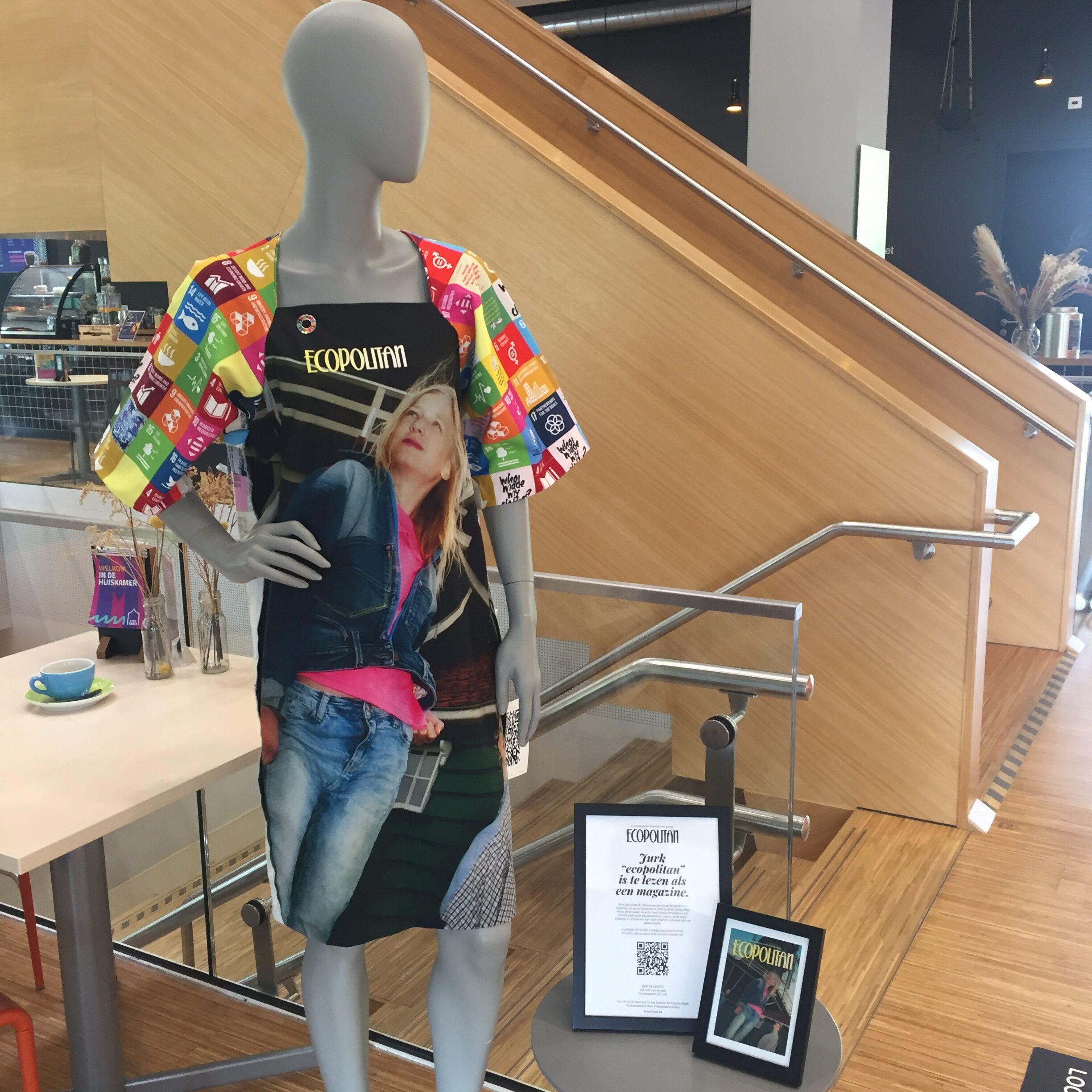 Als actie voor Fashion Revolution Week 2022 is ECOPOLITAN Jurk te lezen als een sustainable fashion magazine. Etalagepop Sophie draagt de jurk en staat prominent bij de trap en leescafé van de Bibliotheek de Stadskamer te Zwolle.