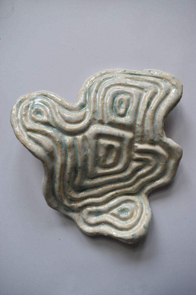In mijn zoektocht naar Rust en Delen heb ik meerdere materialen en vormen uitgeprobeerd. Het experimenteren heeft mij geleid naar handzame keramische objecten. De rust komt terug op twee manieren in deze objecten. In het maken van de objecten en bij het gebruiken van het eindresultaat. Tijdens het maken ervaar ik rust in de herhaling van het maken, de kneedbaarheid van de klei en het wat om handen hebben. Uiteindelijk heb ik een handzaam object (palmsteen of kraal) met een structuur wat gebruikt kan worden om je handen bezig te houden als je je moet concentreren of als je tot rust wilt komen.