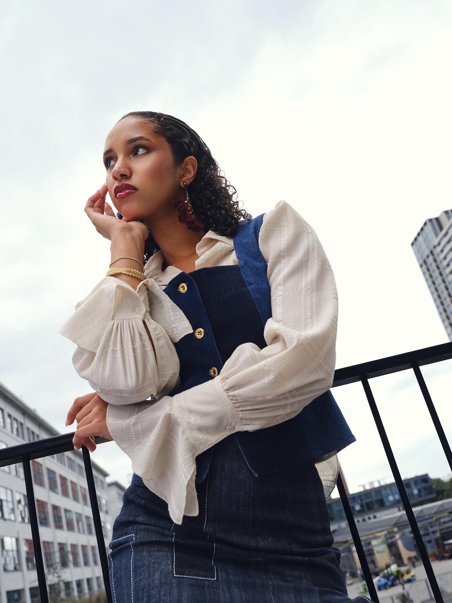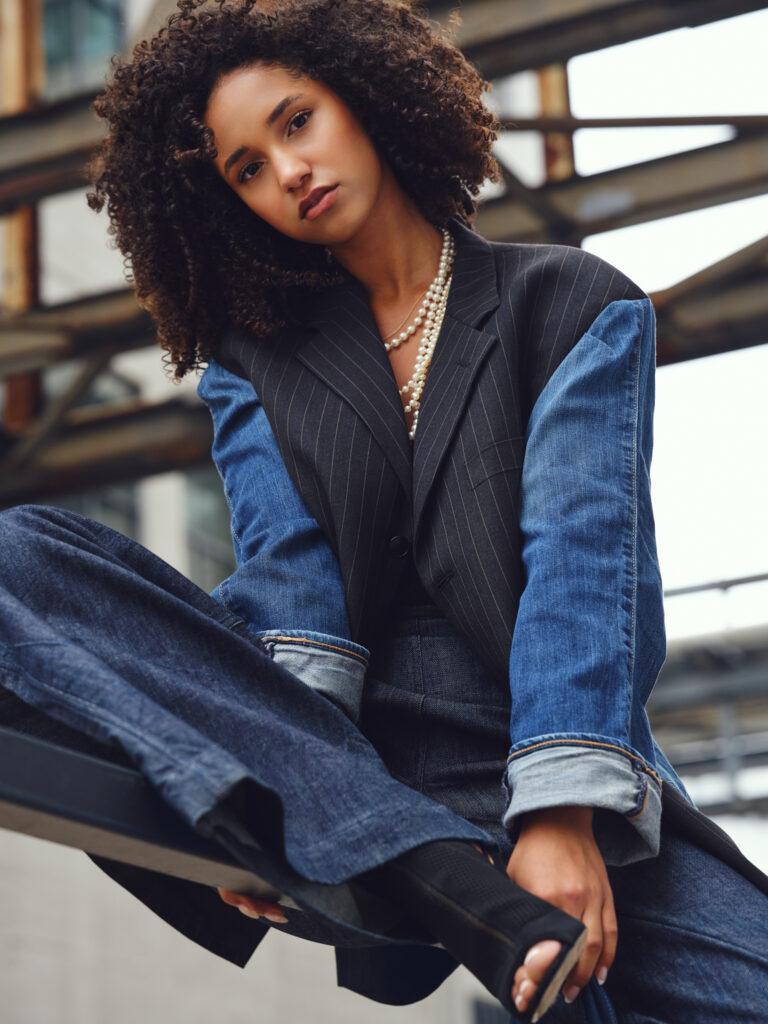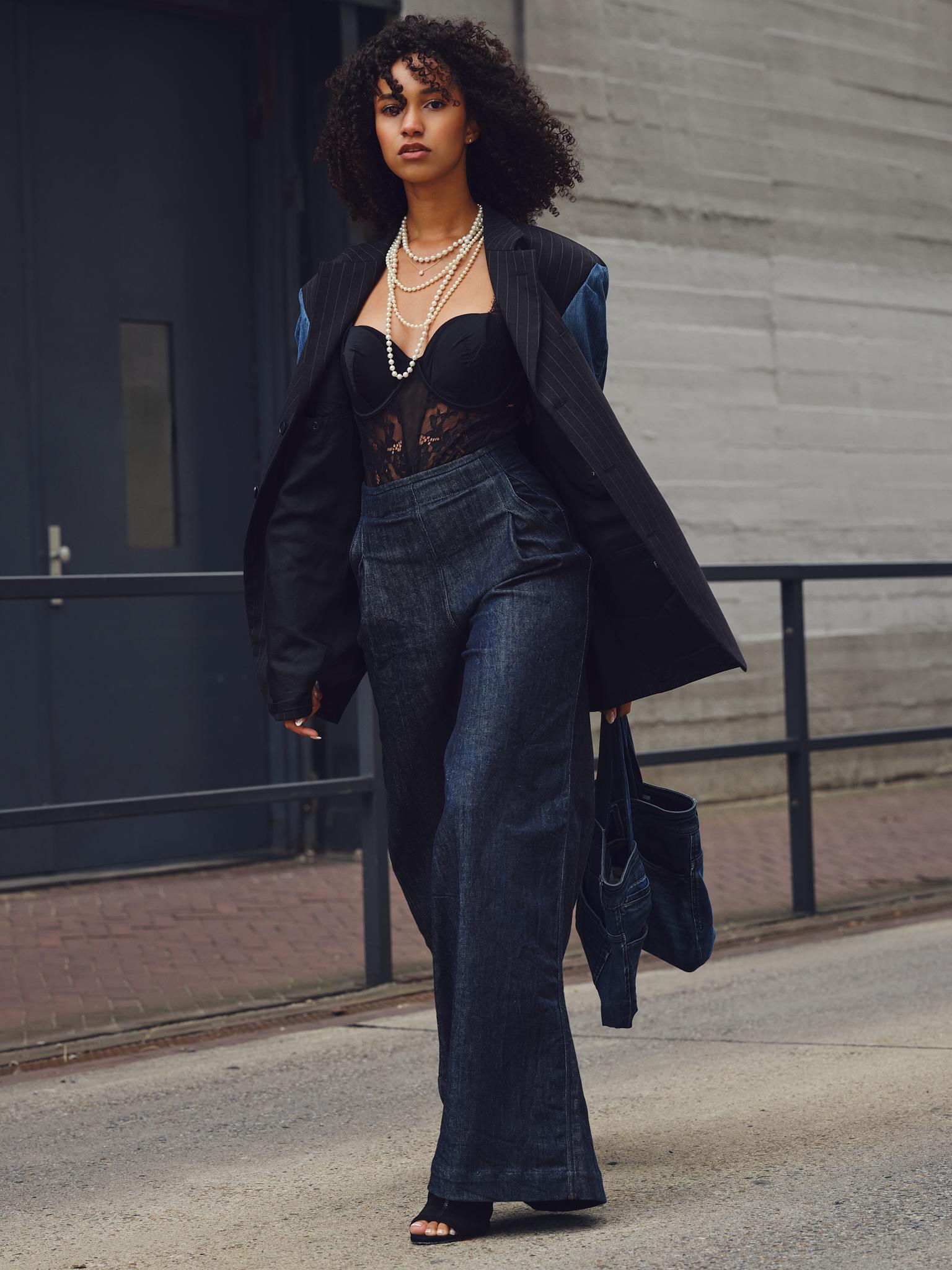 Denim stond ooit symbool voor arbeid en vrijheid en daar geven we een nieuwe betekenis aan: kunstzinnig, duurzaam en vol kracht. Deze look laat zien dat als je verschillende items anders combineert – herken je het colbert? – je weer een totaal andere look & vibe creëert. Hiermee loop je dan ook vol zelfvertrouwen over de street catwalk. Want de perfecte outfit voor fashion week? Ook die kan duurzaam!