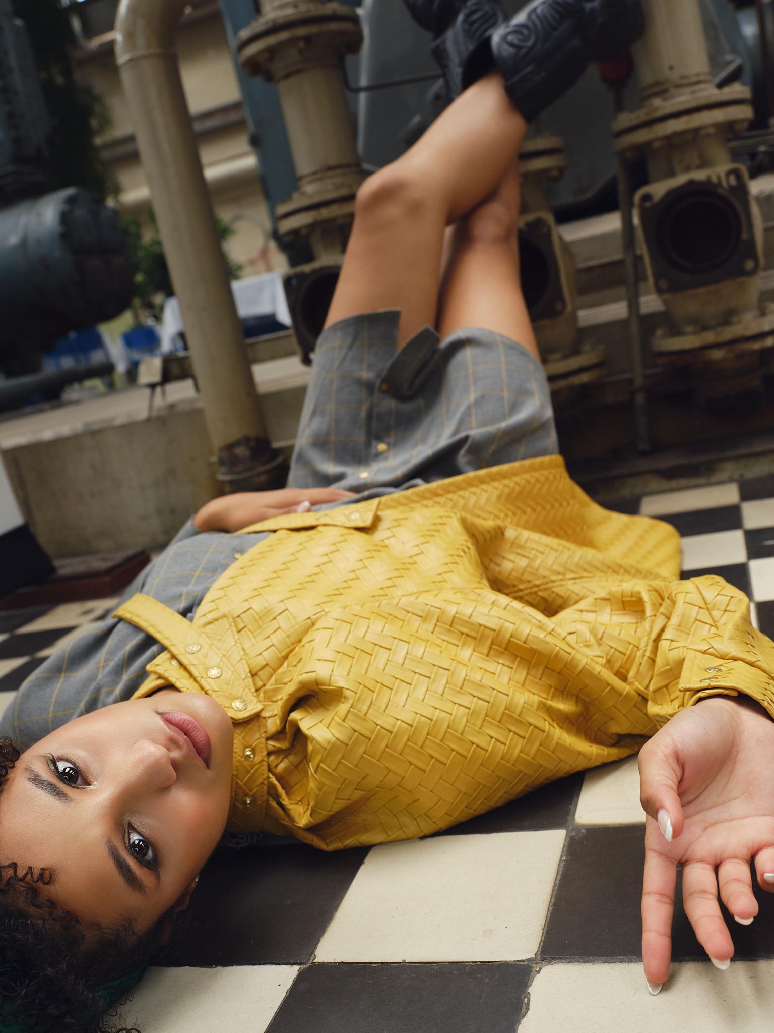 Deze look van deadstock materiaal is voor iedereen die zich niet comfortabel voelt met de looks in de winkel. Iedereen die een statement wil maken en kleur wil toevoegen aan deze wereld. Die creatieve vrijheid gebruikt om dingen in beweging te zetten, net als de motoren en pompen van deze machinekamer.